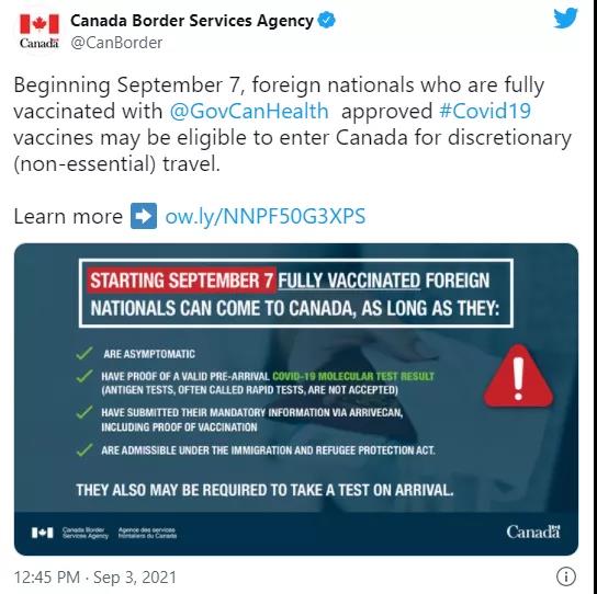 加東時間2021年9月7日上午12:01起,加拿大聯邦政府將開放加拿大邊境: