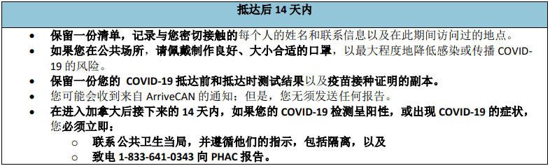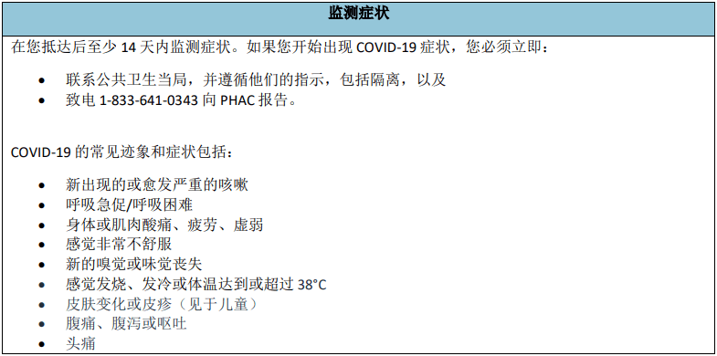 為幫助保護他人安全,減緩COVID-19及其變種在加拿大的傳播,完全接種疫苗且無症状的旅客,雖然入境加拿大時無須隔離,仍需遵守加拿大防疫規定,並持續監測症狀。