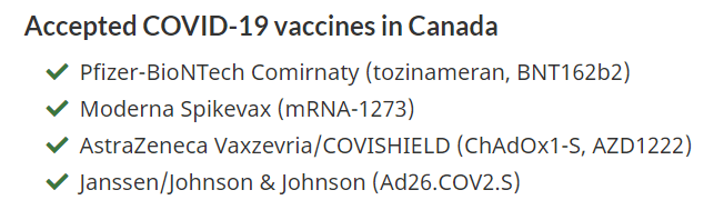 截至目前,加拿大認可的疫苗仍只包含四款:輝瑞、莫德納、阿斯利康、强生。