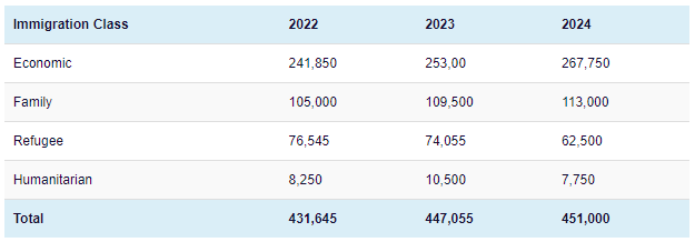 根據最新計畫,2022年吸納的新移民人數中,主要類別分配大致為: