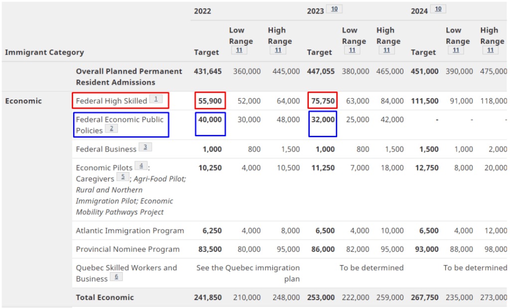 聯邦高技能快速通道抽選(Federal High Skills,包括FSW聯邦技術類、FST聯邦技工類、CEC加拿大經驗類)的移民人數配額大幅縮水: