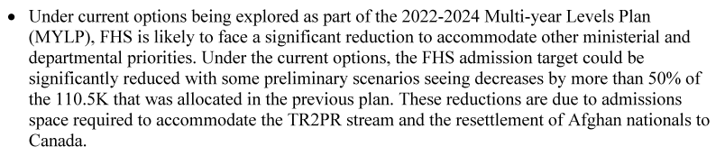 原本的2021-2023年移民計畫中,新移民分配情況則是約60%經濟類別、25%家庭團聚類別、15%難民及人道主義類別。新計畫中增長的難民人數,主要由於加拿大計畫重置4萬阿富汗難民,隨著這項任務的推進,經濟類移民和團聚類移民的占比將逐年回升。