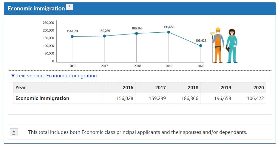2020年受疫情影響,加拿大僅吸納了18.4萬新移民,與34.1萬新移民的目標相去甚遠。於是加拿大移民局在2021-2023年移民計畫中,立下了雄心勃勃的目標,並在2021年成功吸納了超過40.1萬新移民,創下歷史紀錄!