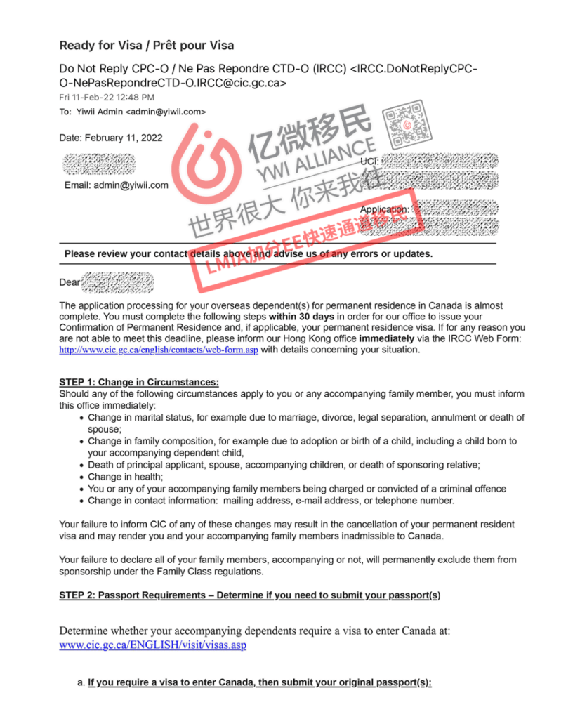 L客戶一家也開始了漫長的等待,在兩年多的時間裡,億微移民多倫多的文案團隊每三個月進行一次調檔,與移民局保持聯繫,不斷查詢催促進度。終於在2022年1月21日收到了重新體檢的通知,停滯不前的申請終於開始重新審核!2月1日客戶全家完成體檢後,非常迅速地10天就收到了成功移民的通知郵件,在2022年2月11日移民獲批!