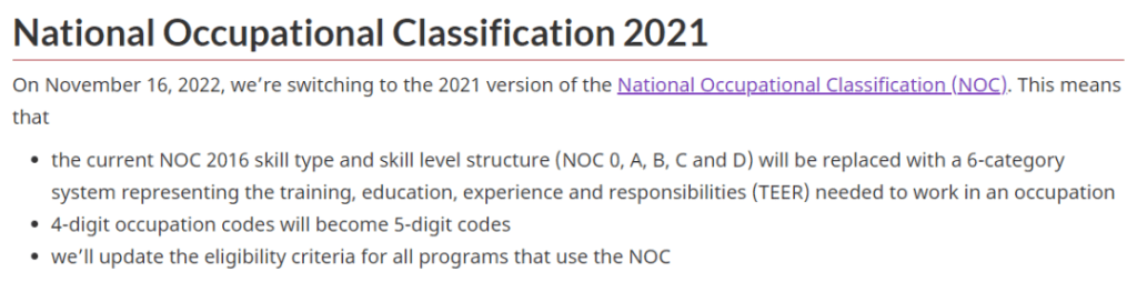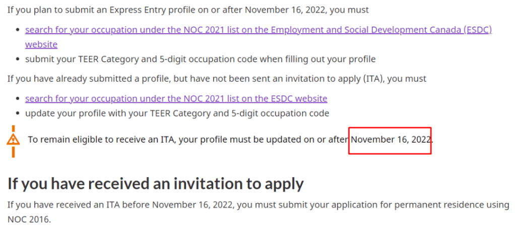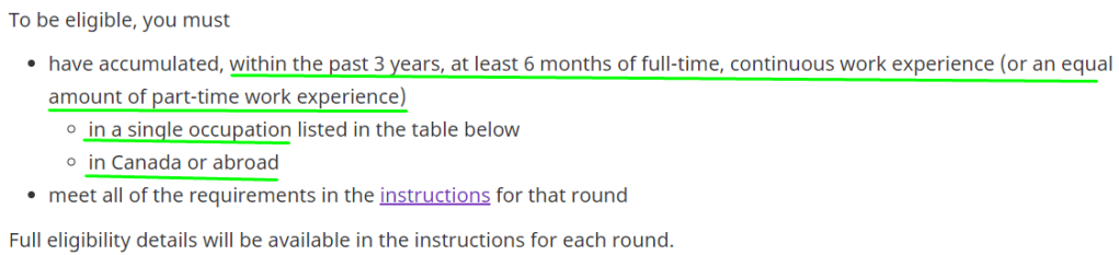 注意:五類職業定向抽選候選人,需滿足過去3年內,同一個NOC職業代碼,至少6個月全職連續工作經驗,或兼職工作滿足同等時長(加拿大境內或境外經驗都可以)。