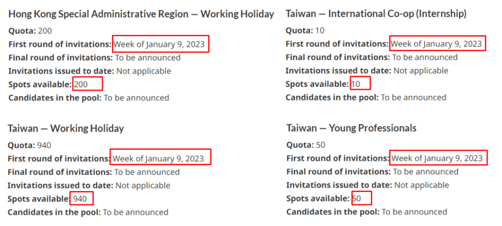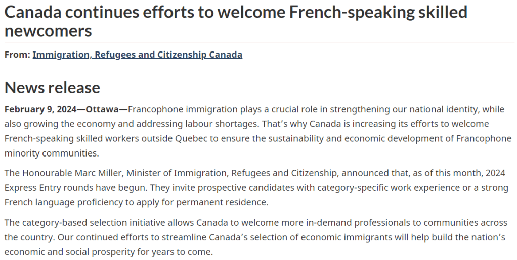 - 定向抽選,單獨邀請法語候選人,2023年相較500+高分的常規抽選,法語抽選最低375分,最高486分;2024年2月僅需365分。